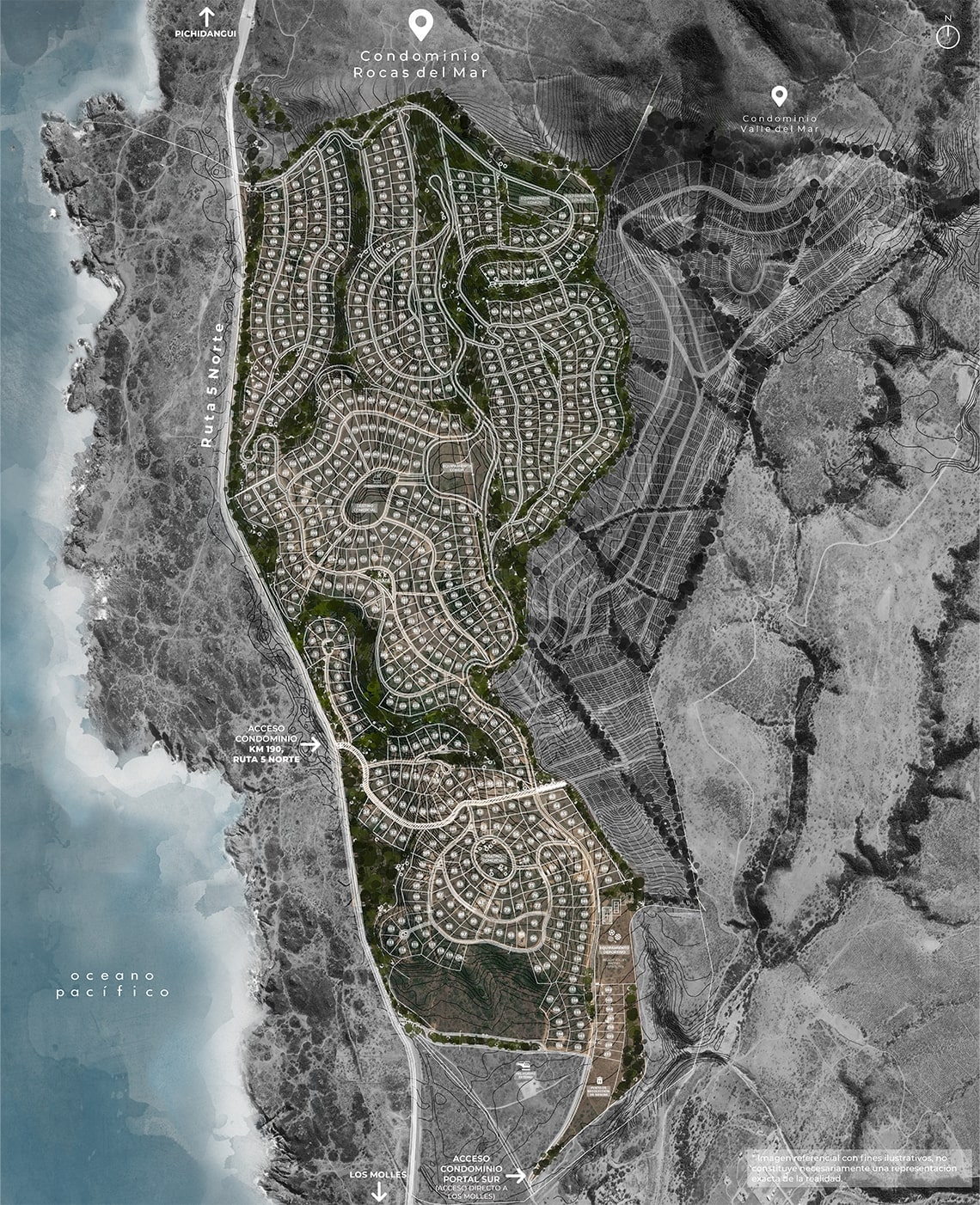 El condominio cuenta con sitios de 5.000 m2 urbanizados bajo tierra con luz y agua, accesos controlados y conexión directa por paso nivel a la playa de Los Molles y más de 160 hectáreas de espacios comunes y áreas verdes.